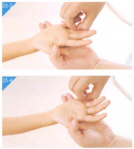 7、推四横纹3分钟。四横纹在手掌面,在食指、中指、无名指、小指的第一指间关节横纹处。用拇指指甲掐揉,称为掐四横纹;四指并拢从食指横纹处推向小指横纹处,称推四横纹。也有用三棱针点刺放血改善积滞,效果也很好(图2 5-1、图 25-2、图25-3、图25-4)。