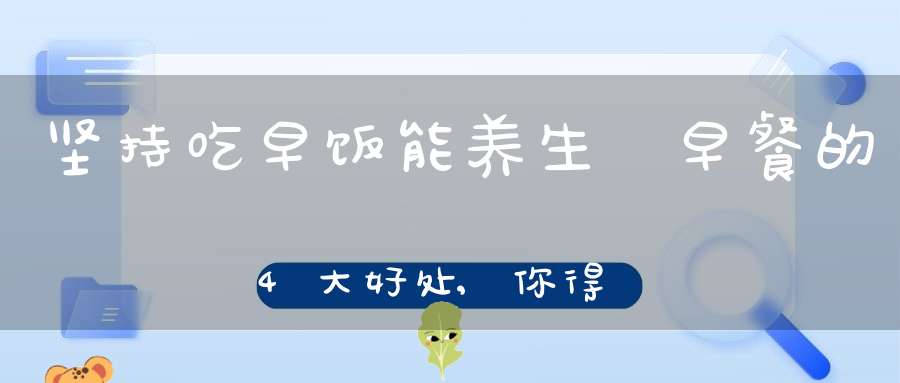 在了解过吃早饭的四大好处之后,会发现坚持吃早饭是可以养生的。坚持吃早饭不仅能够帮助养胃,增强身体的抵抗能力,而且还能够助人养成早睡早起的好习惯,所以坚持吃早饭对于人体来说是极好的,但是同时也要记得吃完早饭后进行适当的运动,以促进早餐的消化。