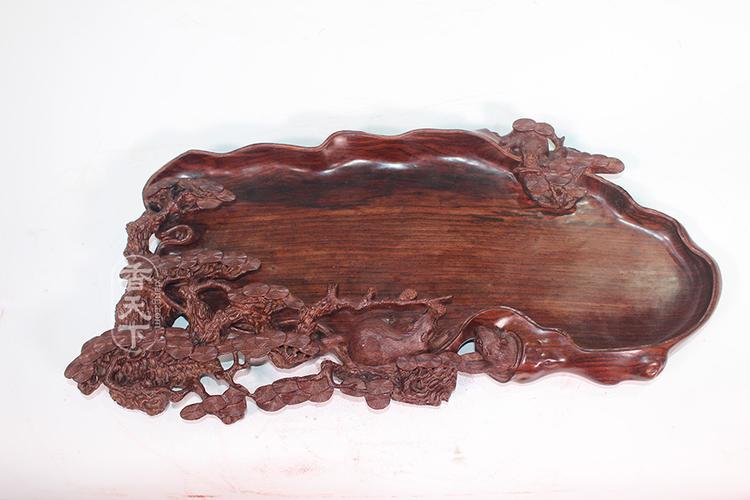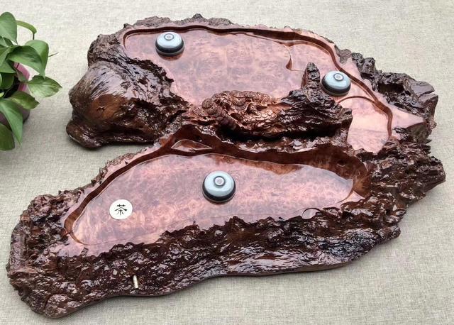木材茶盘。茶盘中木质茶盘应该是应用最广泛且最为人熟知的。说到木质茶盘,首先想到的就是红木茶盘,其次还有黑檀木茶盘和近几年来流行桌面与茶盘为一体的根雕茶盘。木质茶盘具典雅,清新自然气息,与茶文化是相当配搭,所谓古色古香,也很好的衬托其余茶具,韵味十足。好的木质茶盘为品茶氛围增色同时又会给人们实用,养得好的会岁月独有的光感与终身的陪伴,但木质茶盘对比其它茶盘硬度与耐腐性都略差一筹,且如今市面上的木质茶盘多为用杂木仿造,购买时要慎重。