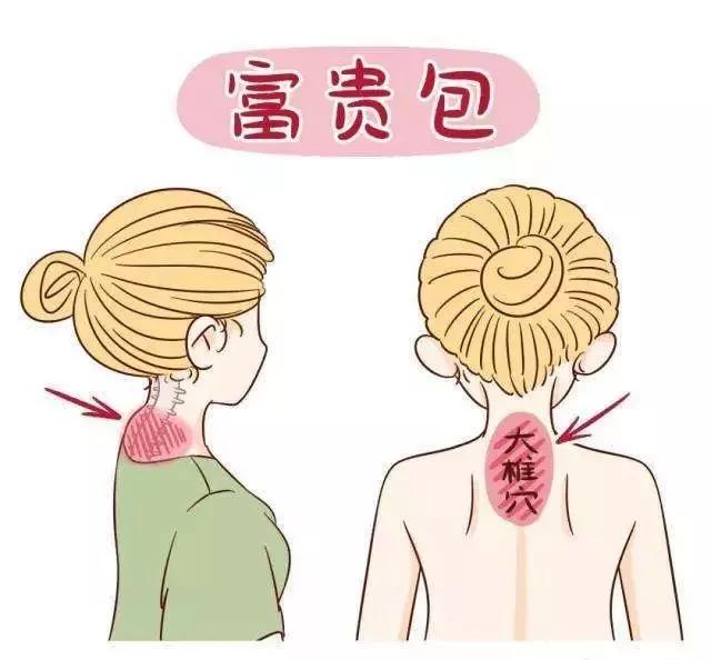 “富贵包”指的是在后背上部颈胸交界处,即第七颈椎和第一胸椎处凸出的硬包块,临床表现是脂肪堆积。