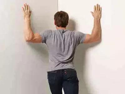 利用墙角或者门,弓步双手臂推墙面,身体向前,辅助打开胸腔,注意一定要在脊柱的延展的前提下推墙,保持1分钟。