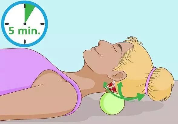 利用网球按摩头部后侧颈部肌肉附着点,放松颈部肌肉,保持1分钟。
