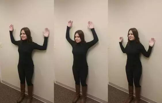 靠墙山式,双手向两侧打开,屈手肘成“招财猫”的样子,慢慢的伸展手臂向上,然后再向下,手肘内夹,肩胛骨相互靠拢,保持5-8个呼吸,上下重复练习。