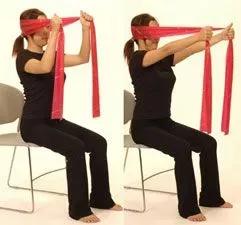端坐在椅子上,双腿分开与髋同宽,将弹力带套在头部后侧;双手拉住弹力带两端,吸气延展脊柱,呼气双手拉弹力带与颈部形成抗组力量。