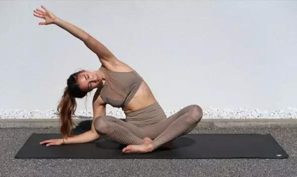 从坐立扭转过渡到坐立侧伸展,右手放于身体右侧,注意肩膀放松下沉;吸气时,伸出左手向上,呼气时,上半身慢慢向右侧侧屈;注意核心微收,两侧坐骨不离地,每侧保持5~8个呼吸。