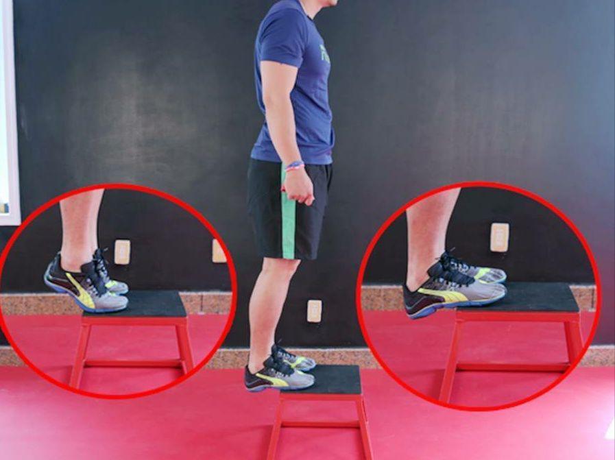 脚后跟低于前脚掌,这样能够让小腿得到更充分的伸展,脚踝受到更多刺激。