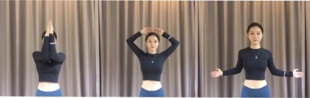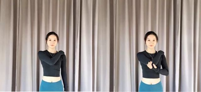 脖颈中正,弯曲双手肘,手肘贴靠,最大幅度的往前伸,有点含胸,尽量保持手肘贴住,往上走到极限,不得不分开时往外往后扩展胸腔,再往后往下拉,每一个点都做到最大幅度,做到痛苦;此动作可以有效的打开肩周关节,做15次。