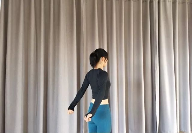 脊柱立直,双手外旋向后,自主发力向上抬向中间靠拢,保持30秒,注意不要推肋骨。