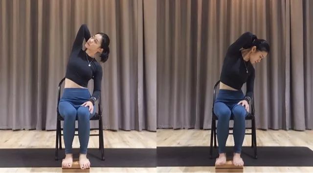 右手臂上举,曲手肘,掌心贴上背部,呼气,脊柱向左侧曲,感受右侧手臂、背部轻微拉伸;在此基础上再往左下方做扭转,加深拉伸感;40秒,左右两侧。