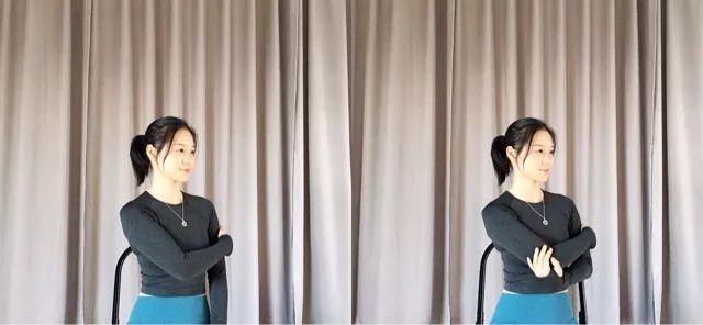 曲右手肘在左大臂处,身体往内旋转一点,手臂自主发力,(可用另一手辅助)保持30秒。