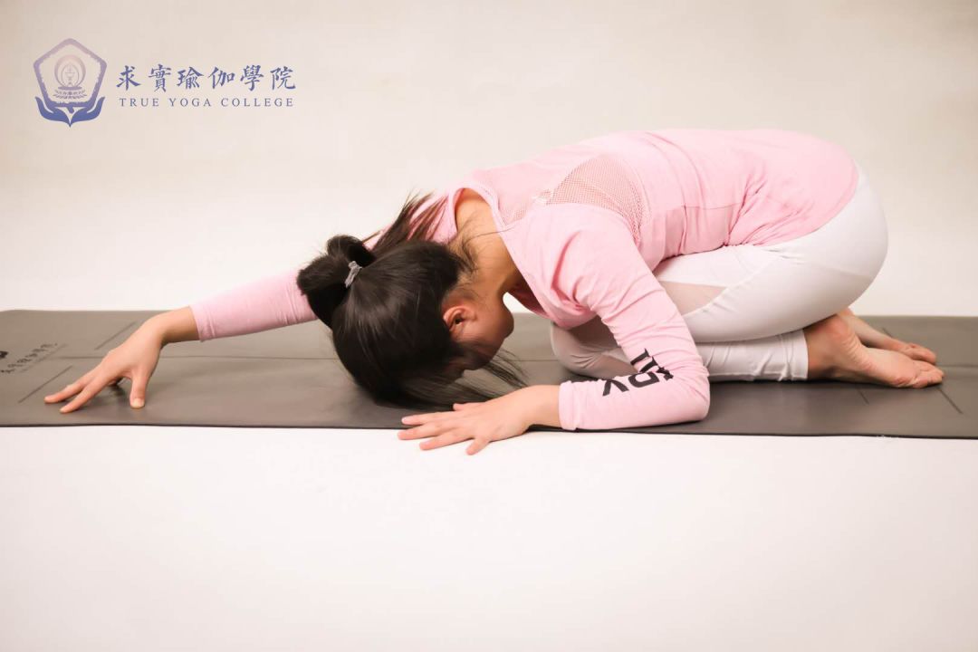 婴儿式进入双手带着上半身往右45°,右手收至右肩下方。左手持续向前走,至最远处停留,指尖点地。每一次吸气都藉由左手向前伸展左侧身体,呼气延展尾骨向后保持10次呼吸,换边(以文字为主)