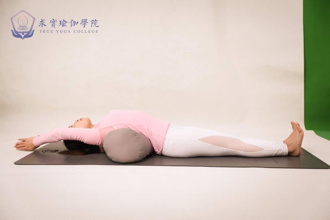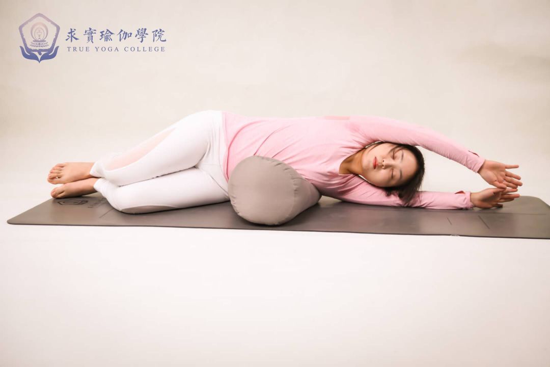 躺在抱枕上,抱枕在中背部的位置双腿并拢,双手向上延展保持1分钟以上体式练习可做单侧强化练习(伸展凹侧,训练凸侧),也可以做整体训练强化脊柱周边肌群。