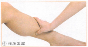 4、按摩者一手四指置于外踝,拇指按压被按摩者下肢的复溜穴,直至被按摩者有酸痛感为宜(图④)。