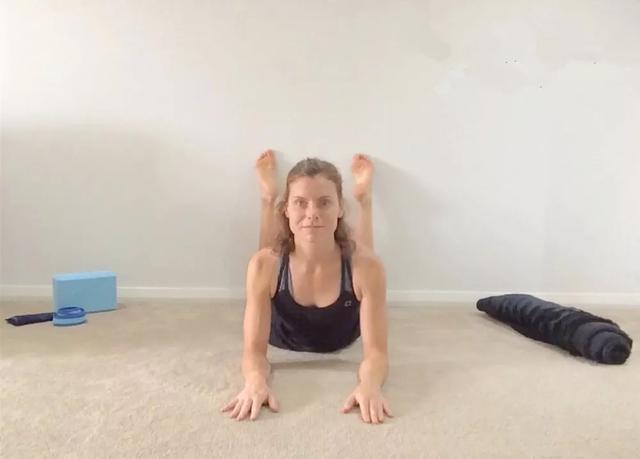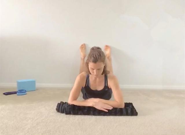 旁边放一块毛毯,俯卧屈手肘,手肘小臂撑地屈双膝,小腿和脚背贴墙脚跟靠近臀部,保持3分钟