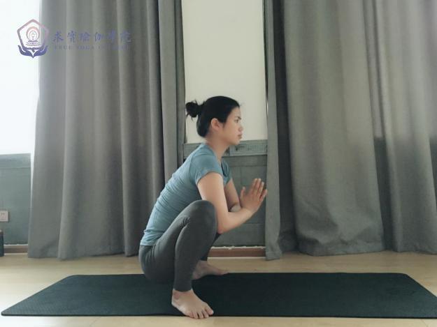 屈手肘双手在双膝之前合十;