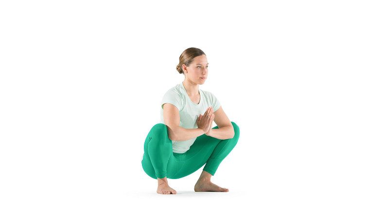 从鹰式退出回到山式,进入下蹲祈祷式。双腿分开与髋同宽并下蹲。