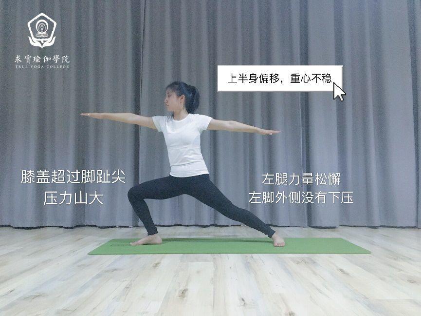 常见错误的战士二,后腿伸不直,腿内侧肌肉没有启动,前腿屈膝超过脚趾尖,给膝盖整个上半身的压力。或者骨盆随着前腿的转向偏移,上半身没有垂直地面……这样的战士二做完,不仅身体累,还给膝盖带来伤害,得不偿失!