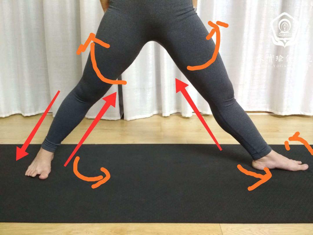脚外延推地(将骨盆的力推到脚外沿),内侧足弓踩实(有余力的上提,将力量拉至骨盆)
