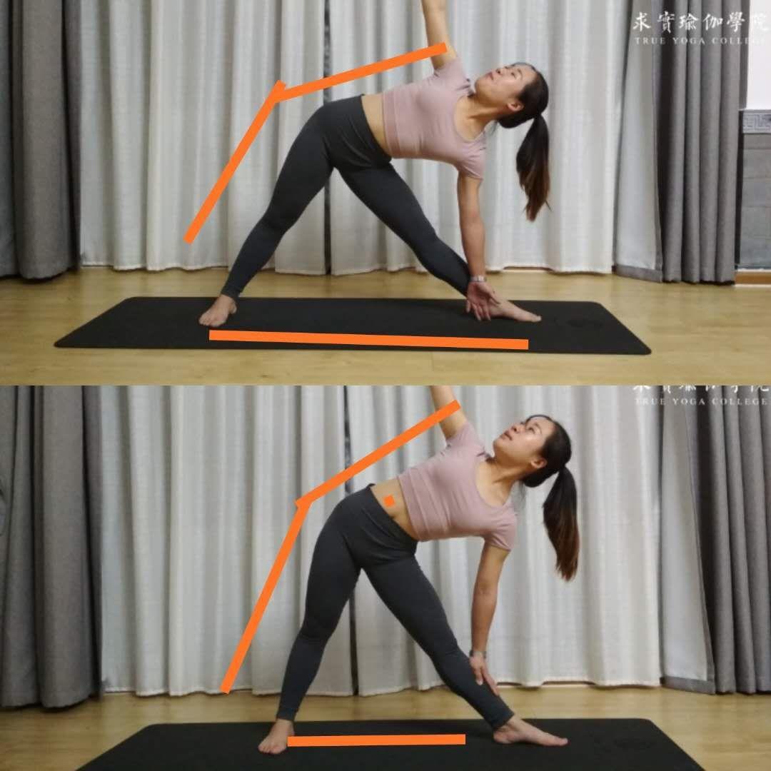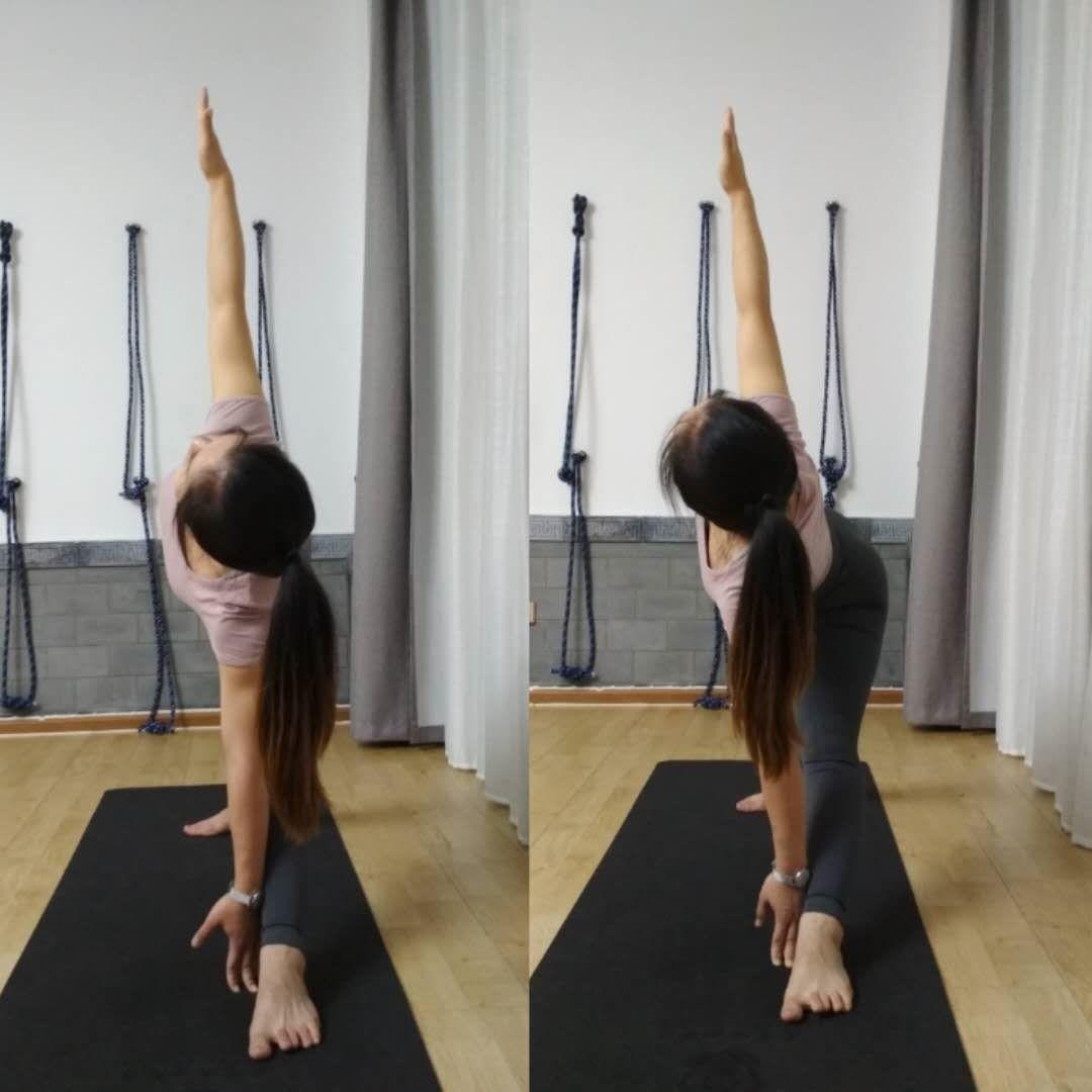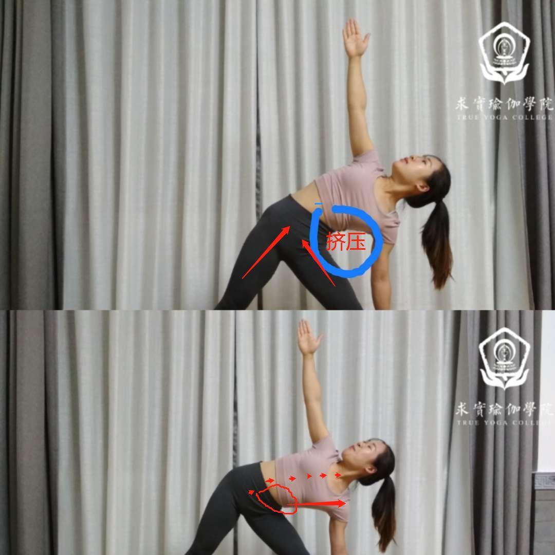 不知道双脚的距离怎么放,手不知道放在哪里,后方脚的内扣角度,前方脚的角度......侧屈时,前侧腿压力大,后侧腿踩不住......脊柱没有办法等长延展,身体没有办法和腿一个平面,做体式时容易推髋,骨盆一前一后......