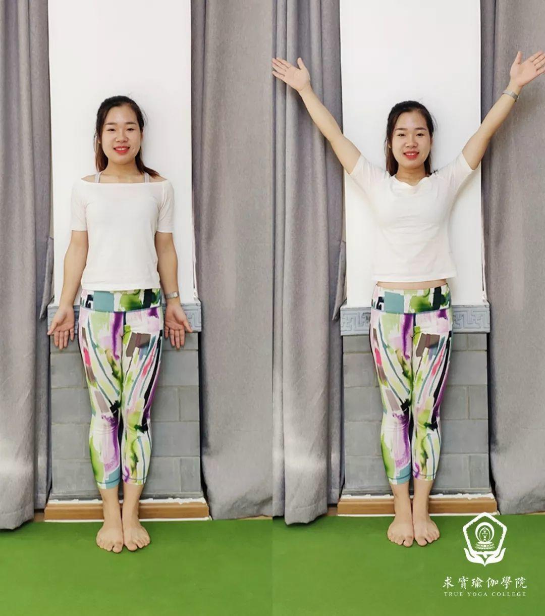 贴靠墙壁,脚跟离开墙壁让臀部可以正好轻轻贴墙,山式站立。
