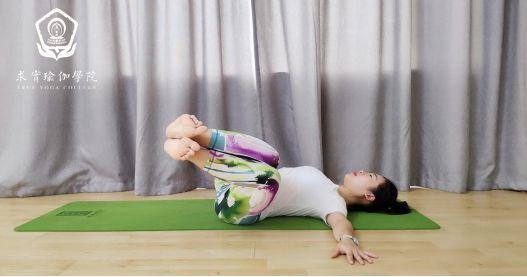 吸气将脊柱延展,后脑勺轻推地,双肩向两侧舒展,肩胛骨压实垫面,呼气时骨盆带动腰椎一节节导向左侧,核心收紧。