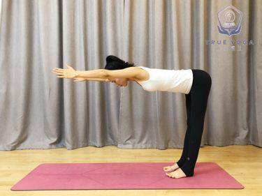 呼气以腹股沟为折点身体向前向下,上半身与地面平行,眼看下方垫面。