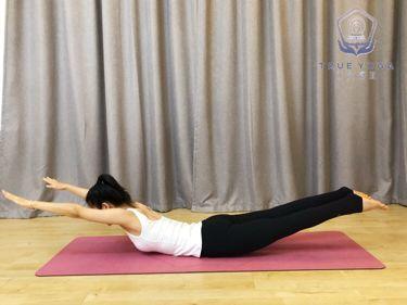 吸气背部发力,腹部微收,将上半身向上抬起,肚脐以上离开垫面,肚脐以下贴实垫面。