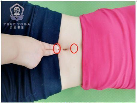 3、用手指放在肚脐的上和下去测量腹直肌的宽度,去感觉到两侧腹肌向中间挤压手指