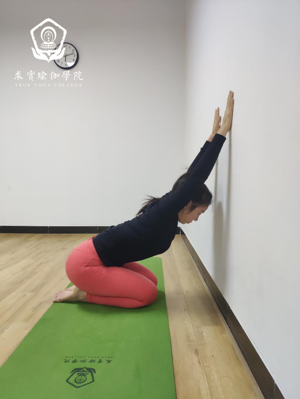 英雄坐进入,双手掌推墙,头部放松,身体慢慢向下